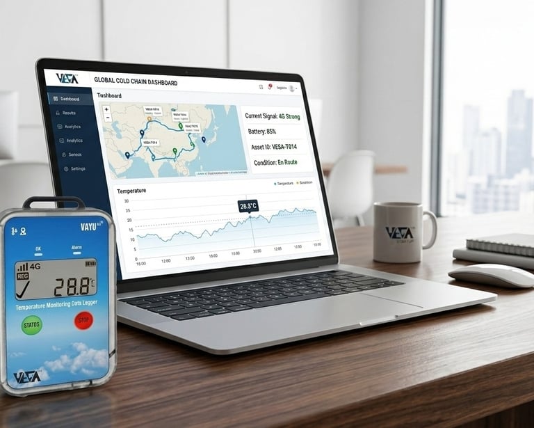 Shipping active pharmaceutical ingredients from Ahmedabad involves multi-modal transport. QA managers need end-to-end visibility. The Vega Vayu 4G GSM Temperature and Humidity Data Logger tracks the shipment using precise GPS. Its store-and-forward technology ensures no data is lost during cargo flights. Upon arrival, the Nuxt.js frontend generates an unalterable PDF report, ensuring rapid customs clearance and a flawless audit trail.